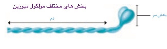 - ۲- میوزین: ضخیم و دربین رشته های اکتین قرار گرفته اند و دارای سرهایی برای اتصال به اکتین هستند.